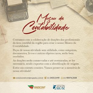 O Sindicato dos Contabilistas de Criciúma, com a parceria do O Sindicato das Empresas de Serviços Contábeis, Assessoramento, Perícias, Informações e Pesquisas do Sul de Santa Catarina – Sescon Sul – , está convidando todos os profissionais da área contábil para implantar o Museu da Contabilidade. Para isso, precisa de doações de peças relacionadas à […]