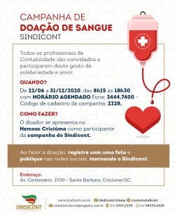 O Sindicont incentiva seus associados a participarem da campanha de doação de sangue ao Hemosc de Criciúma, que este ano é de 22 de junho a 31 de dezembro. O doador deve se identificar como participante da campanha, que tem como código de cadastro o número 2228. O horário deverá ser agendado no Hemosc, que […]